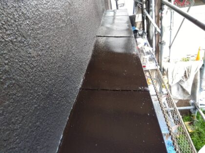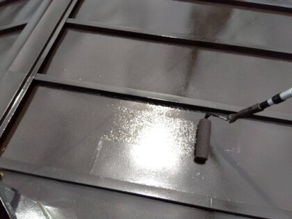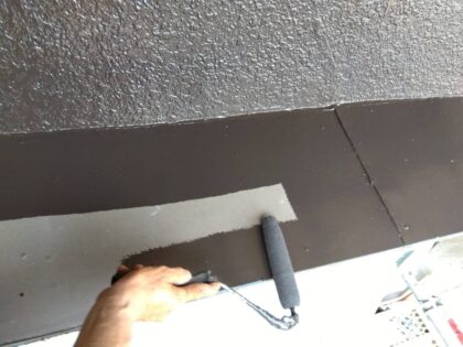3回目に塗る仕上げ塗装です。塗料によって決まっている標準塗布量や乾燥時間をしっかりと守ることにより、強い塗膜を作ります。ローラーが使えない狭い箇所などは、ハケでしっかりと塗り込みます。同じ塗料を使用しても、塗り方によって耐久性が全く違ってきます!