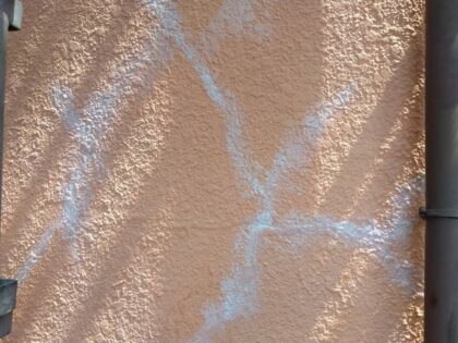 外壁の至る所にクラック(ひび割れ)が見受けられます。今は細いクラックでも放置すると次第に大きくなり、建物の耐久に悪影響を及ぼすため、塗装する前にクラックを補修する必要があります。