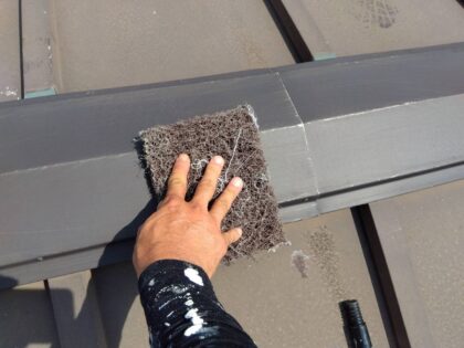 軒樋の仕上げ塗装です。ローラーが使えない狭い箇所などは、ハケでしっかりと塗り込みます。