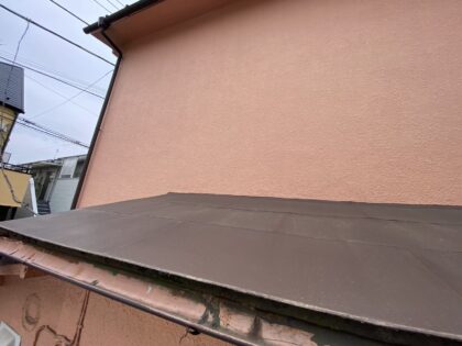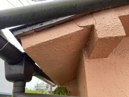 浴室上の屋根について、浴室の湿気の影響で下地が劣化し、表面の軒先モルタルが崩れかけています。浴室部分の屋根は下地ごと貼り替え、軒先モルタルは板金で覆うことで改善が可能です。