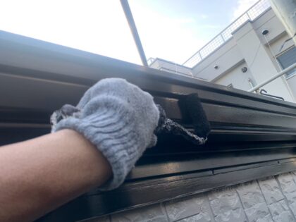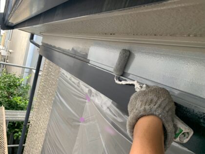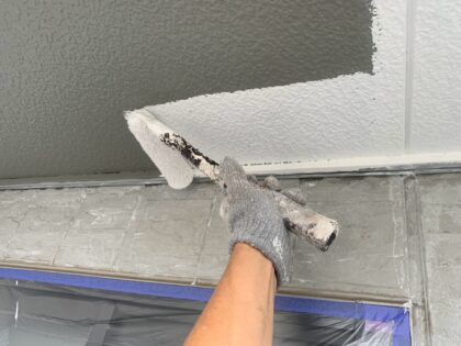 3回目に塗る仕上げ塗装です。塗料によって決まっている標準塗布量や乾燥時間をしっかりと守ることにより、強い塗膜を作ります。ローラーが使えない狭い箇所などは、ハケでしっかりと塗り込みます。同じ塗料を使用しても、塗り方によって耐久性が全く違ってきます。