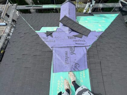 屋根から漏水しないよう、べニア下地の上に防水シートを水下から水上方向へ100mmの重ねをとりながら貼ります。上側のシートが下側のシートに上からかぶることで屋根の下に雨水が入ることを防ぎます。
