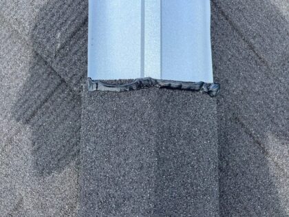 棟板金のジョイント部にはシーリングを入れてから板金を被せます。