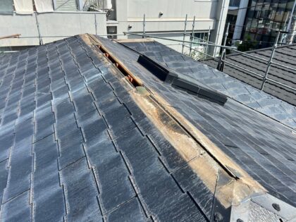 既存屋根材はスレート屋根です。石質の薄い板を使用しているため、劣化や反りがしやすい材料です。