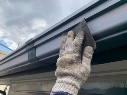 塩ビ雨樋を塗装前にペーパー目あらし処理をしています。