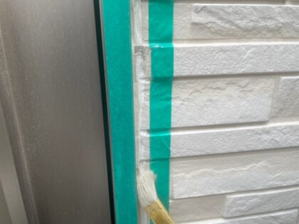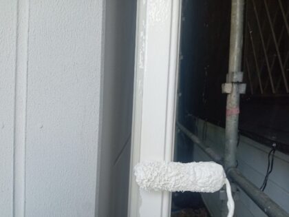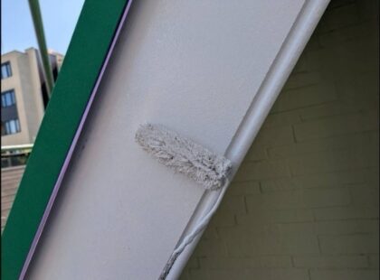 3回目に塗る仕上げ塗装です。塗料によって決まっている標準塗布量や乾燥時間をしっかりと守ることにより、強い塗膜を作ります。ローラーが使えない狭い箇所などは、ハケでしっかりと塗り込みます。同じ塗料を使用しても、塗り方によって耐久性が全く違ってきます!
