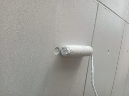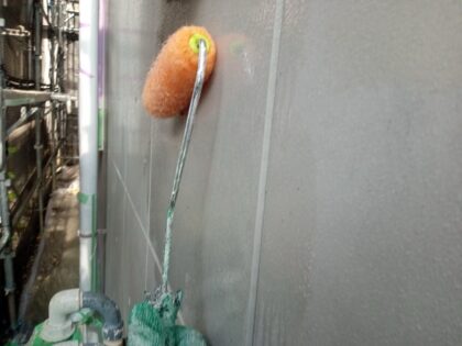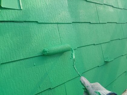 3回塗りの2回目の中塗り作業です。手塗りのローラー工法で、3回も塗り重ねることを標準仕様としています。従来の吹き付け工法とは違い、施工実績豊富な職人が手塗りローラー工法で何度も塗料を重ね塗りすることによって、長期に渡り美しく耐久性の強い塗膜を生み出します。