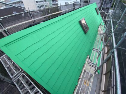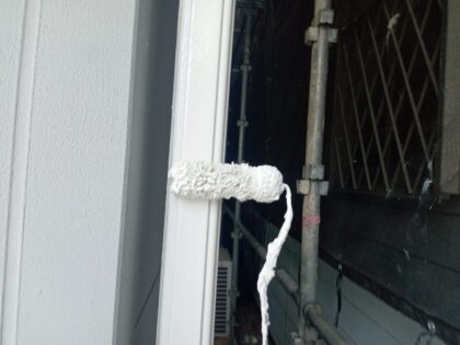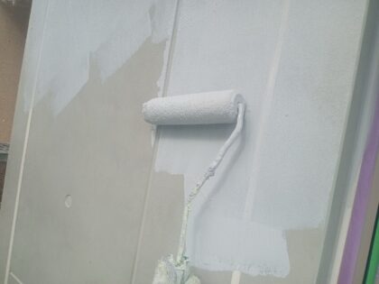 下屋根コロニヤルの下塗りです。下塗り塗料は、塗装面と仕上げ塗り塗料の密着性を高める接着剤のような役割があり、 上塗り塗料だけでは密着力が弱く、塗装面にそのまま塗料を塗ったとしても、すぐに剥がれてしまいます。 下塗り用塗料を使い密着性が高めることで、塗装が剥がれにくくなり、塗料本来の性能や耐久性を発揮します。
