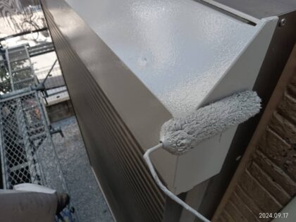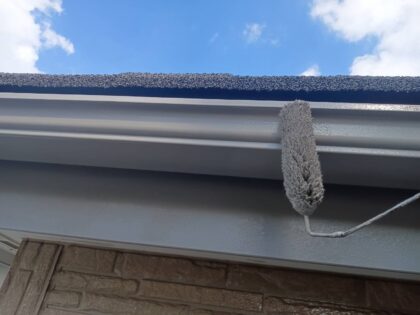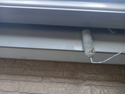 軒樋の仕上げ塗装です。ローラーが使えない狭い箇所などは、ハケでしっかりと塗り込みます。