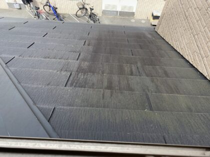 ・1階北側の屋根に汚れが溜まっています。高圧洗浄で洗い流してから塗装を推奨します。
