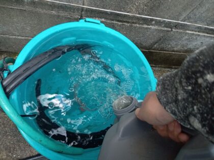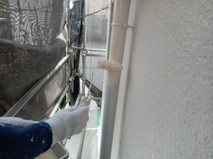 雨樋塩ビパイプの下塗りをしています。塗る塗料は仕上げ塗料材料と同じです。