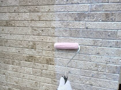 3回塗りの2回目の中塗り作業です。手塗りのローラー工法で、3回も塗り重ねることを標準仕様としています。従来の吹き付け工法とは違い、施工実績豊富な職人が手塗りローラー工法で何度も塗料を重ね塗りすることによって、長期に渡り美しく耐久性の強い塗膜を生み出します。