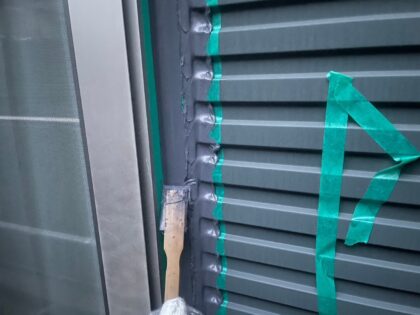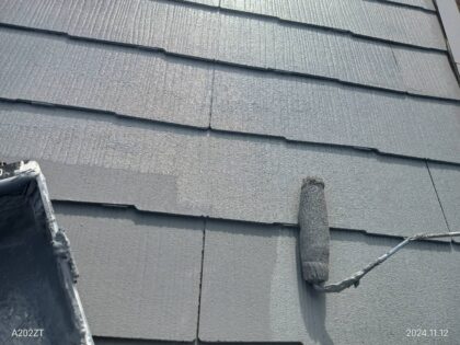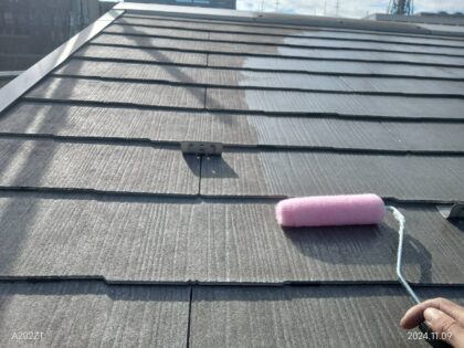 下屋根コロニヤルの下塗りです。下塗り塗料は、塗装面と仕上げ塗り塗料の密着性を高める接着剤のような役割があり、 上塗り塗料だけでは密着力が弱く、塗装面にそのまま塗料を塗ったとしても、すぐに剥がれてしまいます。 下塗り用塗料を使い密着性が高めることで、塗装が剥がれにくくなり、塗料本来の性能や耐久性を発揮します。