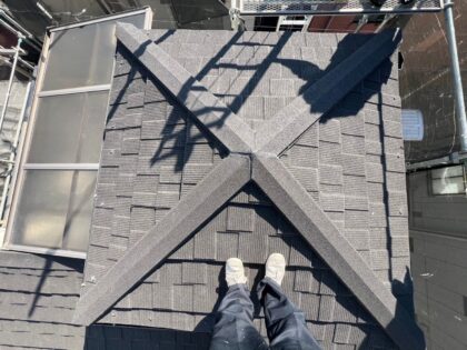 防水シートを貼り終えたら、ケラバや軒先、入隅(壁際)の先端部から屋根材を設置します。棟部分に下地となる貫板をビス止め固定をし貼ります。強風の影響により浮いたり剥がれたりしないよう強固に止めます。