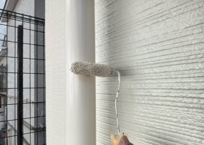 3回目に塗る仕上げ塗装です。塗料によって決まっている標準塗布量や乾燥時間をしっかりと守ることにより、強い塗膜を作ります。ローラーが使えない狭い箇所などは、ハケでしっかりと塗り込みます。同じ塗料を使用しても、塗り方によって耐久性が全く違ってきます!