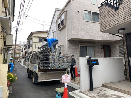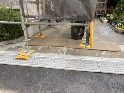 足場搬入時は、搬入用トラックが現場前にとまります。事前に近隣へのご挨拶を行い、状況によっては道路使用や占用許可を申請します。