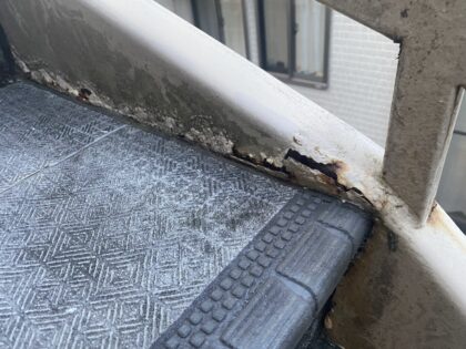 一部が錆びています。全体に広がる前に古い塗膜と錆を落とし、サビ止め材を塗ることで耐久性を長持ちさせます。サビの完全除去はできません。