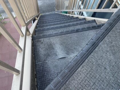 階段シートが劣化し浮いています。貼り替える必要があります。