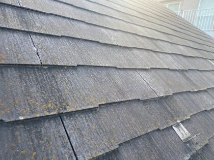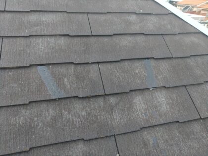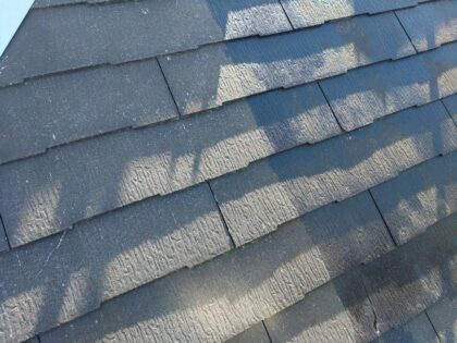 屋根の表面にコケやカビが繁殖しています。塗膜の劣化による防水効果の低下、又は日当たりが悪いことが原因と考えられます。高圧洗浄でコケとカビを取り除き塗装する必要があります。