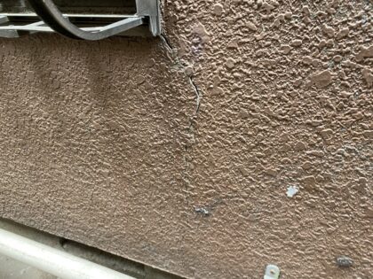 外壁の至る所にクラック(ひび割れ)が見られます。雨水がクラックから侵入しないよう、各クラックに併せた補修をして塗装する必要があります。