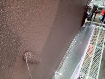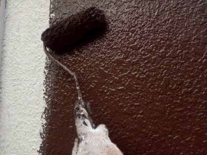 3回目に塗る仕上げ塗装です。塗料によって決まっている標準塗布量や乾燥時間をしっかりと守ることにより、強い塗膜を作ります。ローラーが使えない狭い箇所などは、ハケでしっかりと塗り込みます。同じ塗料を使用しても、塗り方によって耐久性が全く違ってきます!