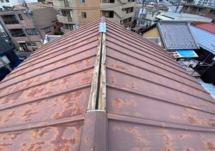 強風で屋根頂点の棟板金がはがれてしまい、工事をご相談いただきました。