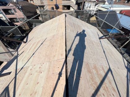 既存屋根材の棟板金を撤去して、構造用合板を増し貼りしました。これにより屋根の強度が回復します。